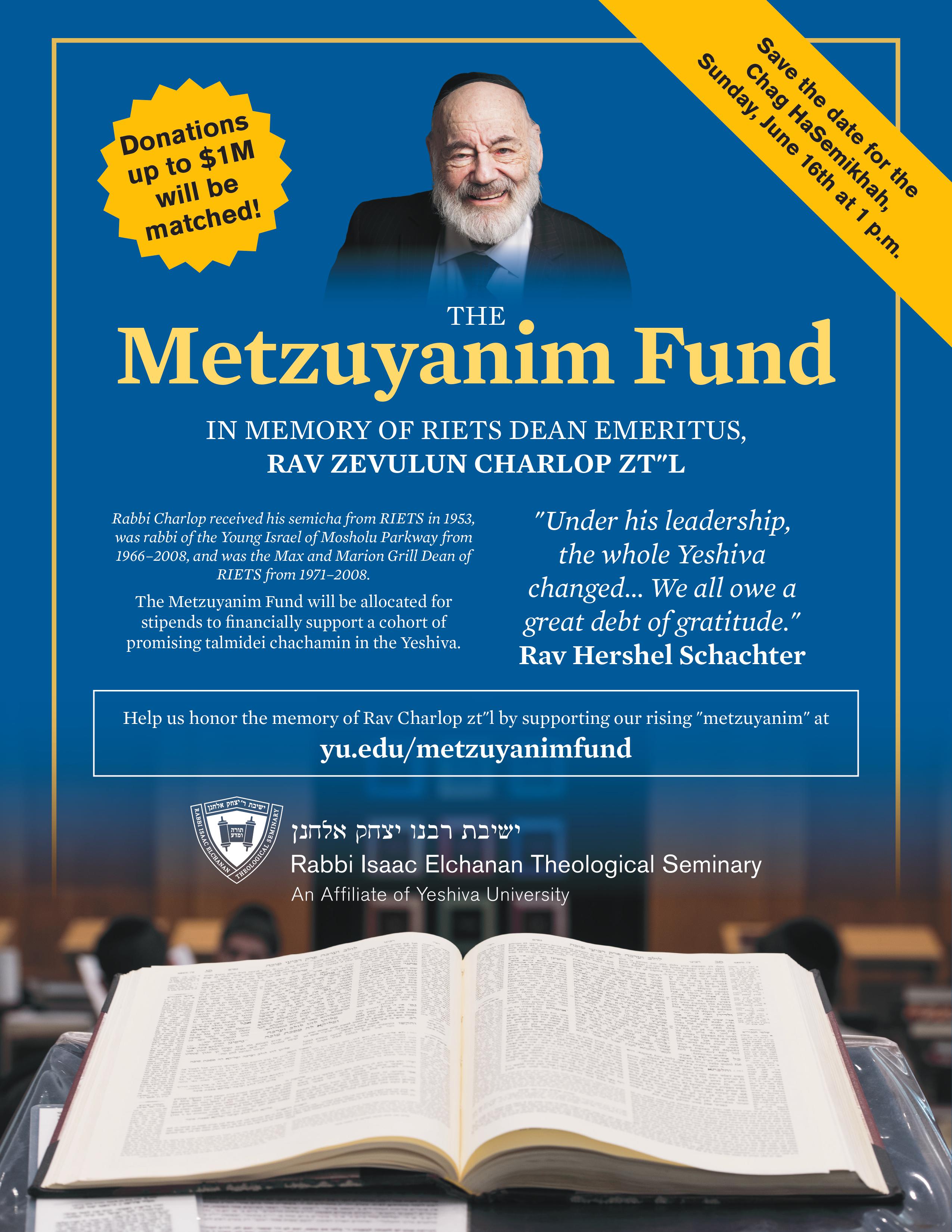 Our Dean Emeritus, Rabbi Zevulun Charlop Zt"l, was a pillar of the RIETS community for decades and aided countless talmidim (or, as he would say, "metzuyanim") on their path to becoming rabbanim. As we prepare to celebrate the Chag HaSemikhah, we are privileged to establish the Metzuyanim Fund in his memory to financially support a yearly cohort of promising talmidei chachamim learning in our kollel. Thanks to a generous donor, contributions will be matched up to $1 million! Please consider supporting our rising metzuyanim in order to continue the tradition of excellence and success in learning that Rabbi Charlop embodied. Donations can be made at https://ja.udk4m.shop/MetzuyanimFund